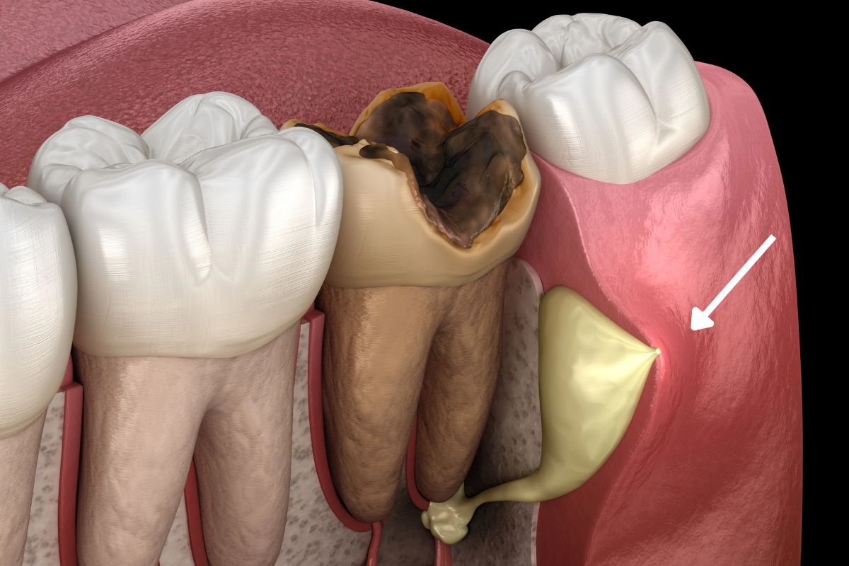 Presiunea puroiului din abces poate crea un traseu (o fistulă) prin os și gingie, permițând puroiului să se dreneze în cavitatea bucală. Acest lucru poate duce la o ameliorare temporară a durerii, deoarece presiunea scade, dar infecția de bază rămâne și continuă să distrugă țesuturile.